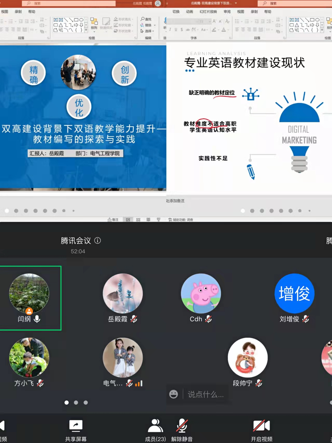 电气分院副教授岳殿霞老师为大家进行培训,培训题目为:双高建设背景下双语教学能力提升—教材编写的探索与实践。岳殿霞老师基于编写出版并投入教学使用的“十二五规划教材”《机电设备专业英语》,从专业英语教材建设的重要性、专业英语教材建设现状、教材编写原则、教材编写与设计、总结等几个方面,介绍了教材编写过程和心得体会。培训中,岳老师结合具体的案例,深入浅出,生动形象。参与培训学习的教师纷纷表示,通过此次培训,对双语教材的编写有了更进一步的认识,对后续相关专业的双语教材编写具有有效的借鉴性和指导性。