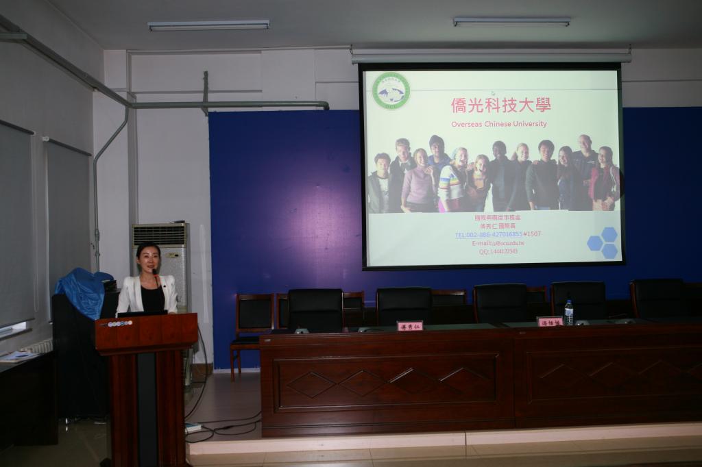 In the afternoon, a promotion meeting of studying aboard was held in the meeting room on the 5thfloor of the administration building by Mr.Fu Xiuren and Mrs. TangTiantian. Mrs. Tang Tiantian introduced the local conditions and customs of Taiwan and the features and conditions for running Overseas Chinese University,and she had an interaction with our students positively.