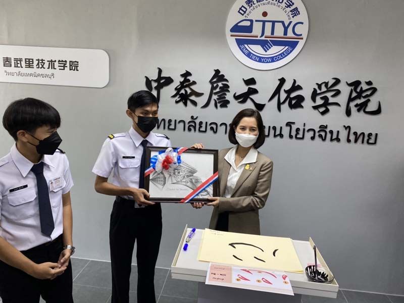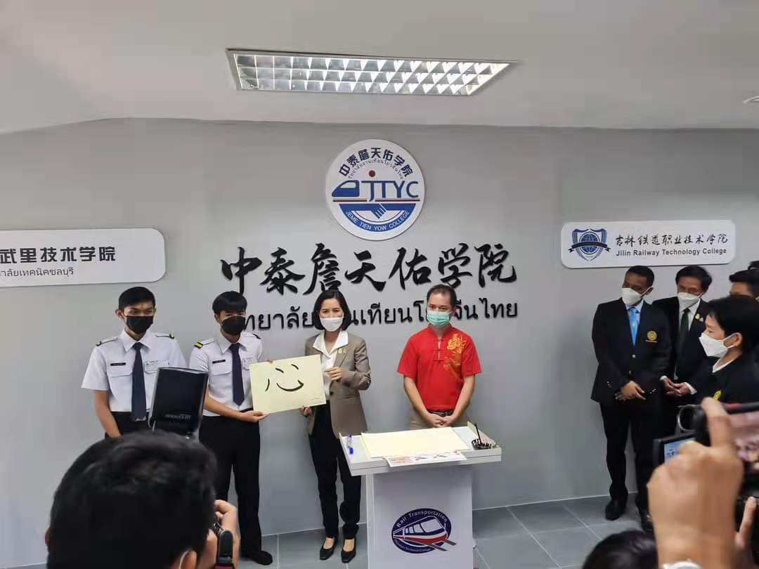 德莉努·天通一行对“中泰詹天佑学院”双学历项目教室进行了实地察看,在详细了解教学方式、教学计划及学生上课情况后,对疫情下“中泰詹天佑学院”高质量高效率顺利推进表示高度肯定,对www.yuebo136.com 雄厚的师资力量和实训资源给予高度赞誉。随后,德莉努·天通为“中泰詹天佑学院”题字,她用中文写了个“心”字,旨在鼓励学员们用心学习技术技能,手牵手、心连心,促进中泰人文交流。学员们也画了一幅高铁漫画,赠与了德莉努·天通女士。