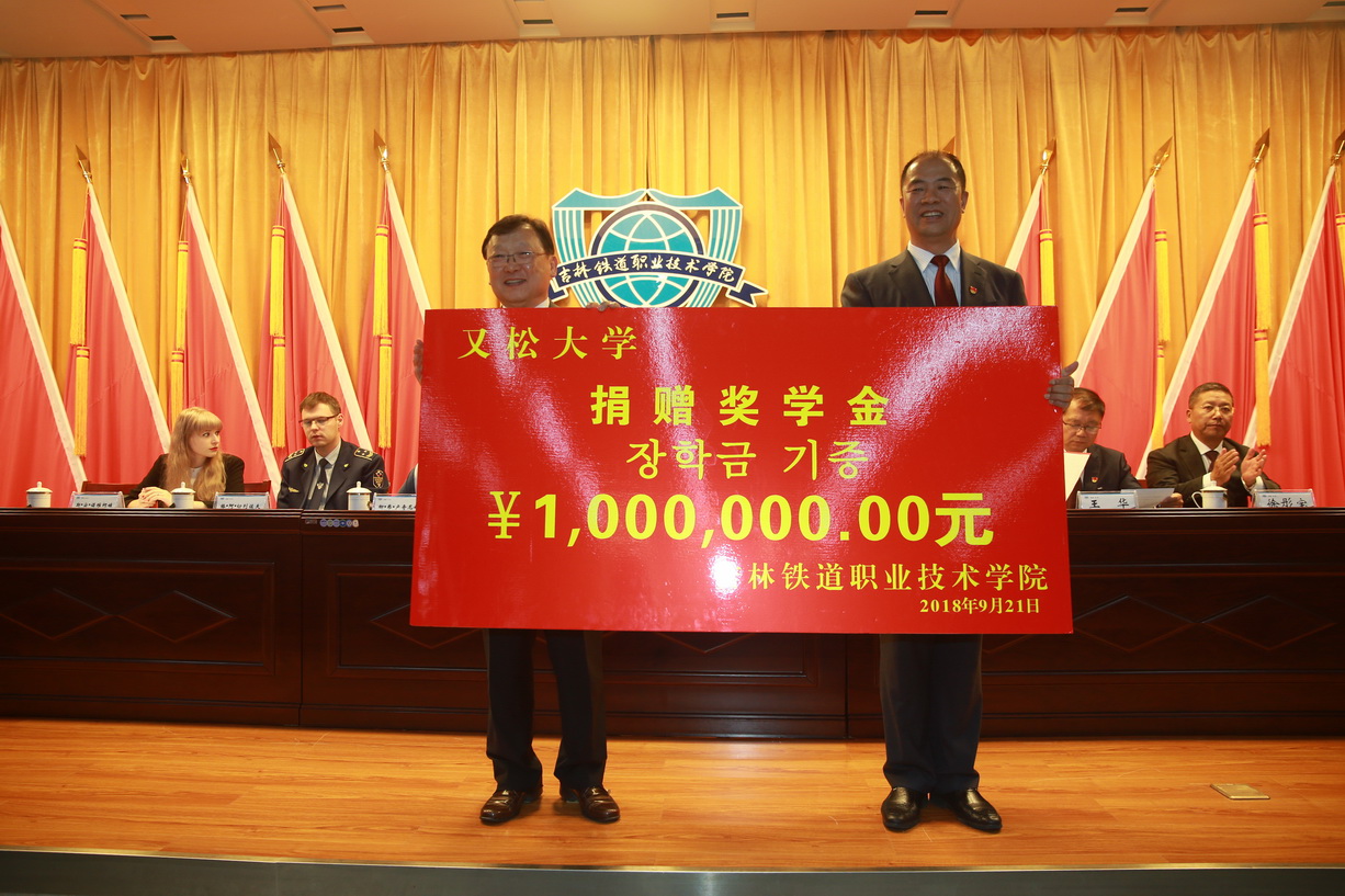 韩国又松大学朴承翼副校长代表又松大学祝贺东北亚高铁学院成立,并向学院捐赠人民币100万元奖学金。