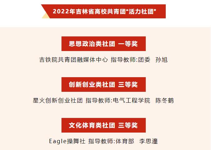 近日,由共青团吉林省委组织开展的2022年吉林省高校共青团“活力团支部”“活力社团”评选活动结果揭晓。经过广泛发动、校级遴选推报、省级团委微信公众号集中展示、专家评审等环节,我校高速铁路动车组制造与维护2021级1班团支部等5个学生团支部荣获2022年吉林省高校共青团“活力团支部”,吉铁院共青团融媒体中心等3个学生社团荣获2022年吉林省高校共青团“活力社团”。