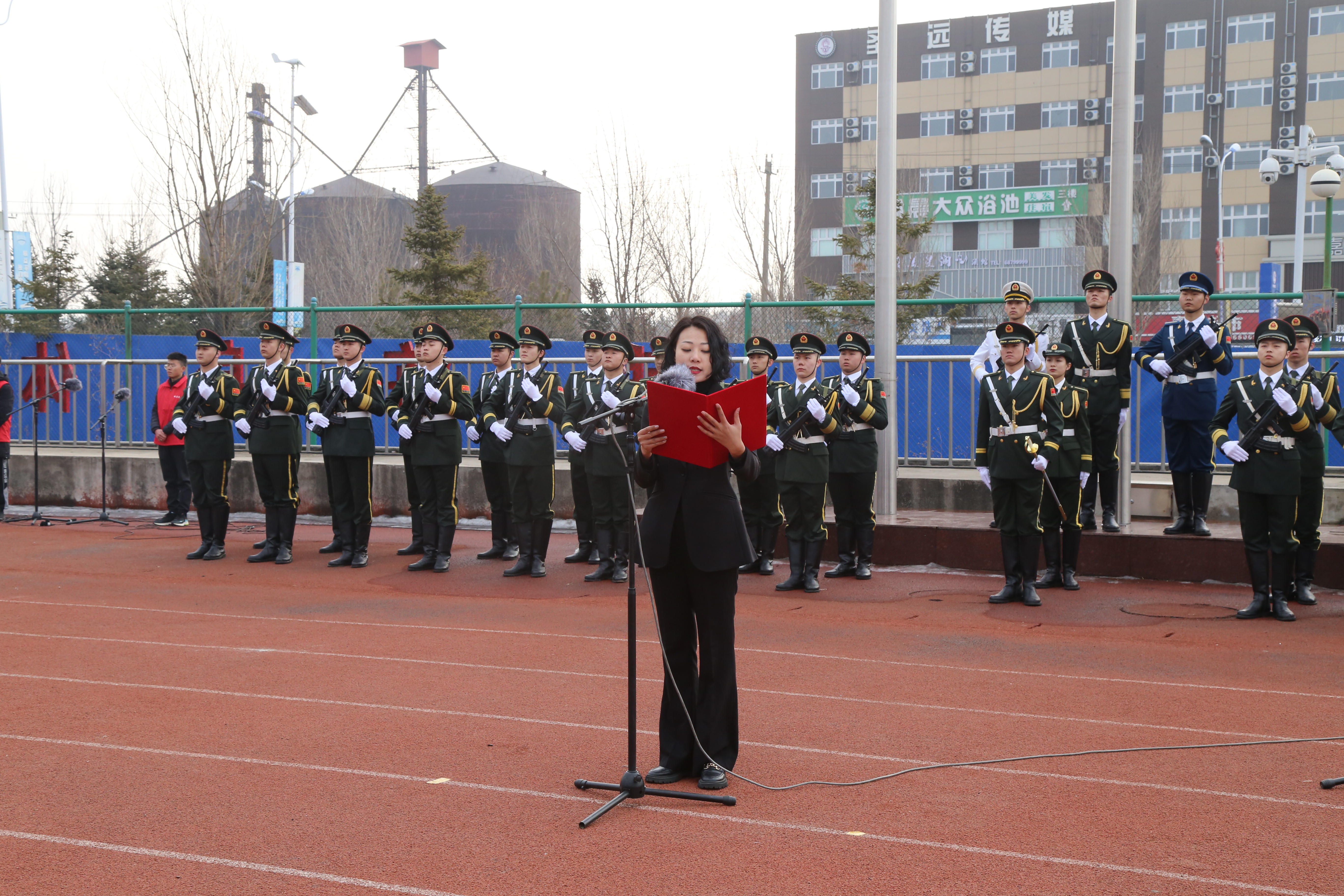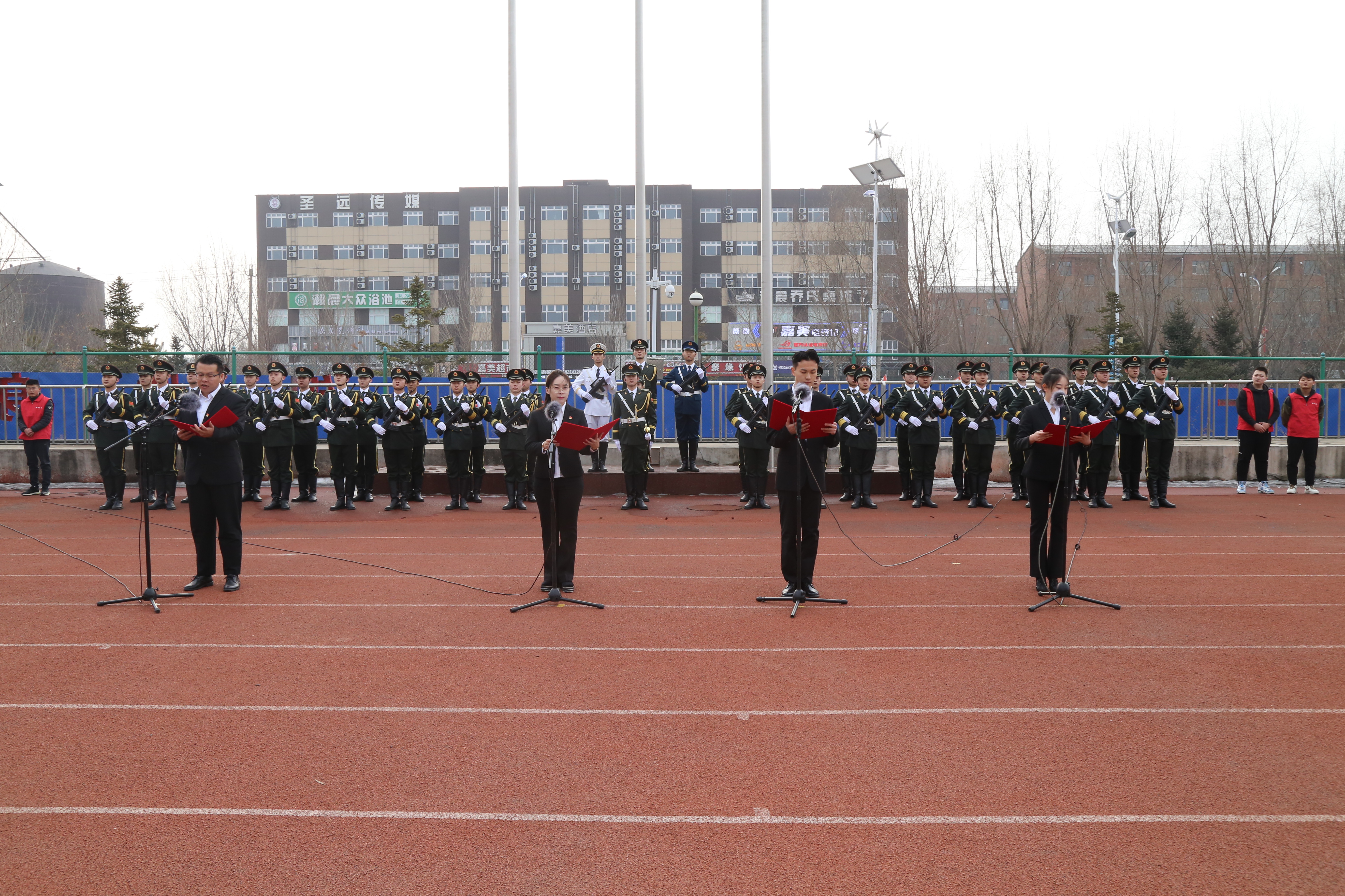 上午8时,伴随着激昂的乐曲,国旗护卫队队员昂首挺胸,迈着铿锵有力的步伐,护卫五星红旗入场。随着激动人心的《义勇军进行曲》响起,全体师生面向国旗,脱帽肃立,齐唱国歌,鲜艳的五星红旗冉冉升起。