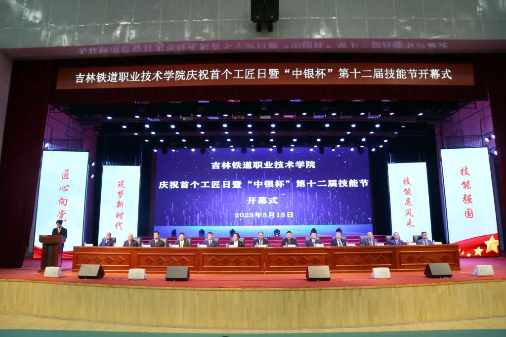 在全党深入开展学习贯彻习近平新时代中国特色社会主义思想主题教育之际,为弘扬劳模精神和工匠精神,营造劳动光荣的社会风尚和精益求精的敬业风气,发挥工匠、高技能人才的帮带、示范作用,激励广大教师踊跃学习,提高技能,强化学生工匠精神和劳动精神的培养。5月15日,学校在活动中心举办庆祝首个工匠日暨“中银杯”第十二届技能节开幕式。中国银行吉林市分行副行长付雷,学校党委副书记、校长曹炳志,纪委书记、监察专员、三级高级监察官孙艳玲,副校长马卫强,副校长李原福出席大会,学校副科级以上干部,部分教职工,2021级和2022级全体学生参加大会,大会由马卫强主持。