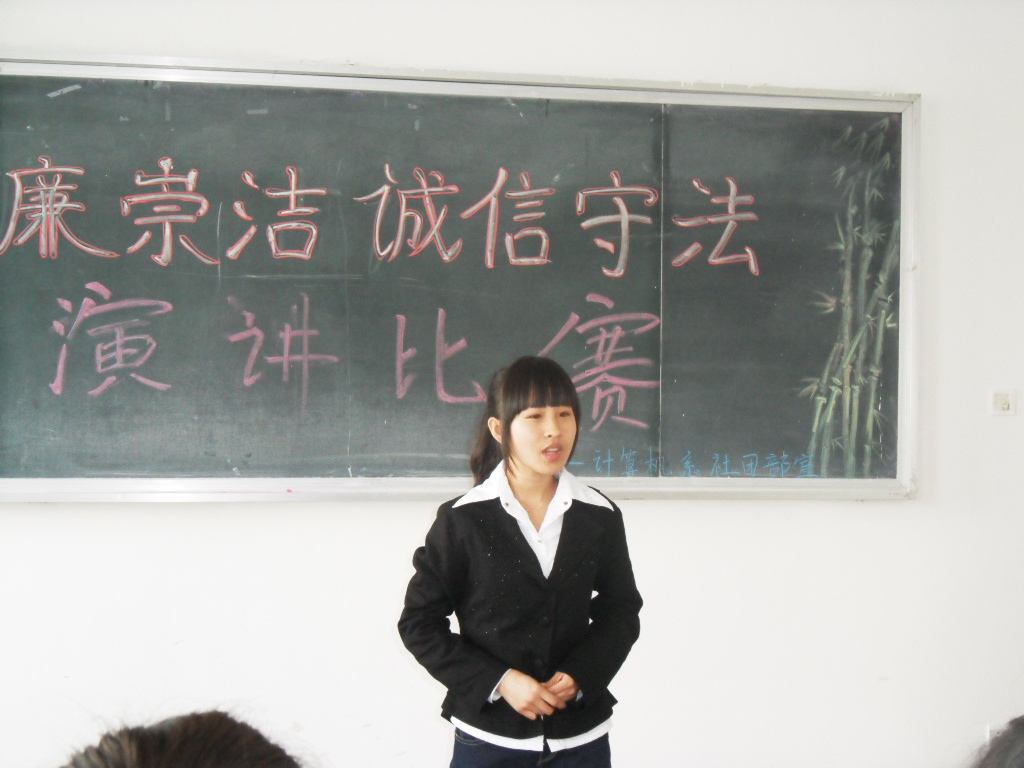 5月20日下午,计算机科学技术系举办了以“敬廉崇洁,诚信守法”为主题的演讲比赛活动。在比赛中,13位选手用历史典故、格言警句等素材,讴歌廉政典型事迹,倡导清廉之风,以当代情为民系,权为民用的孔繁森、任长霞等人民公仆为例,颂扬新时期党员干部立党为公,执政为民的精神风貌。经过两个小时的激烈角逐,电脑艺术设计3092班刘丽丽同学获得一等奖,计算机5061班白鹤、电脑艺术设计3092班刘赵妍两位同学获得二等奖,电脑艺术设计3091班赵岩、计算机(网络)3092班韩峰等10名同学分获得三等奖和优秀奖。