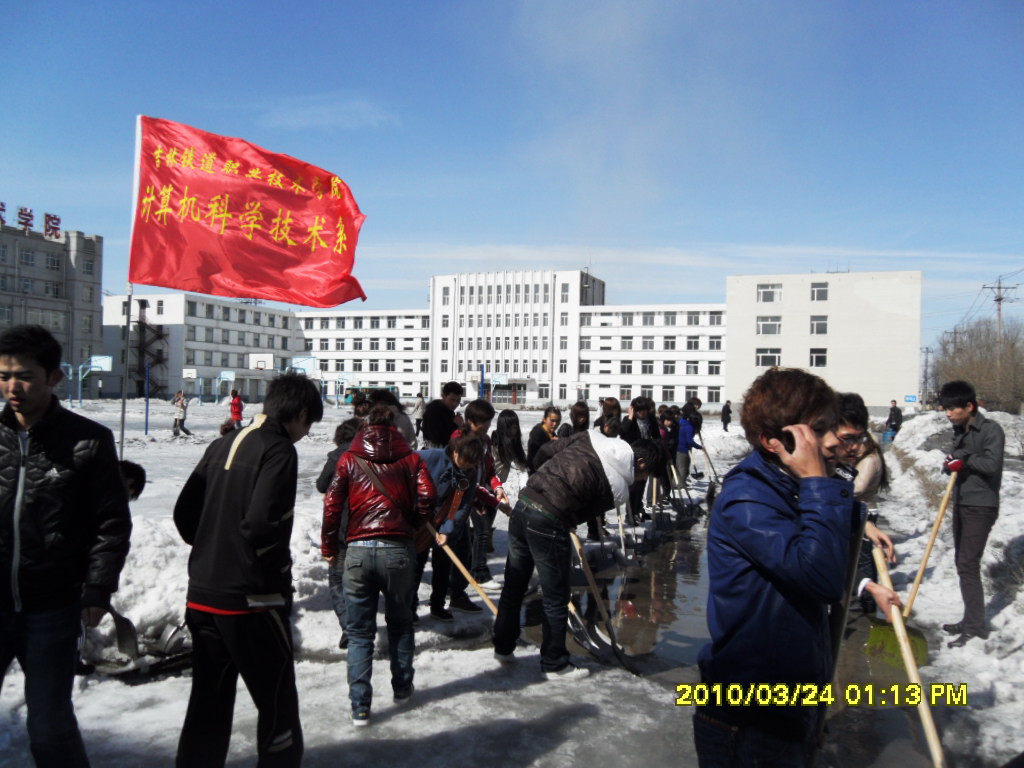 步入三月,本是“清风拂面,细雨润眉”的景象,但今年入春以来的几场降雪让我们经受住了严峻的考验。大雪过后,计算机系全体同学,反应迅速、积极行动,一场清冰雪、保畅通的战役全面打响。 连日来的几场雨雪天气,使原本用于户外活动的场地笼上了厚厚一层冰雪,给师生们正常行走带来了很大的不便。2010年3月24日,同学们利用午休时间,全员待发进入了“战备”状态,对教学楼通往校门口的几条路,逐一清理,达到清理一条路、畅通一条路。雪堆太高,我们就合众人之力一点一点推到;冰太厚,我们有力气大的男同学铲冰;水太多,我们的女同学就一锹一锹戳水;当看到,位于校园东南角——三号楼门前的地沟,因为连日来的雨雪天气,地沟口已全部上冻,使融化了的雪水无法渗漏的时候,几名力气大的学生干部奋力才将地沟通开。 尽管寒风依旧刺骨,尽管未来几天还将有降雪,但60名志愿者喊着口号,干劲十足地用满腔的热情迎接春姑娘的到来。