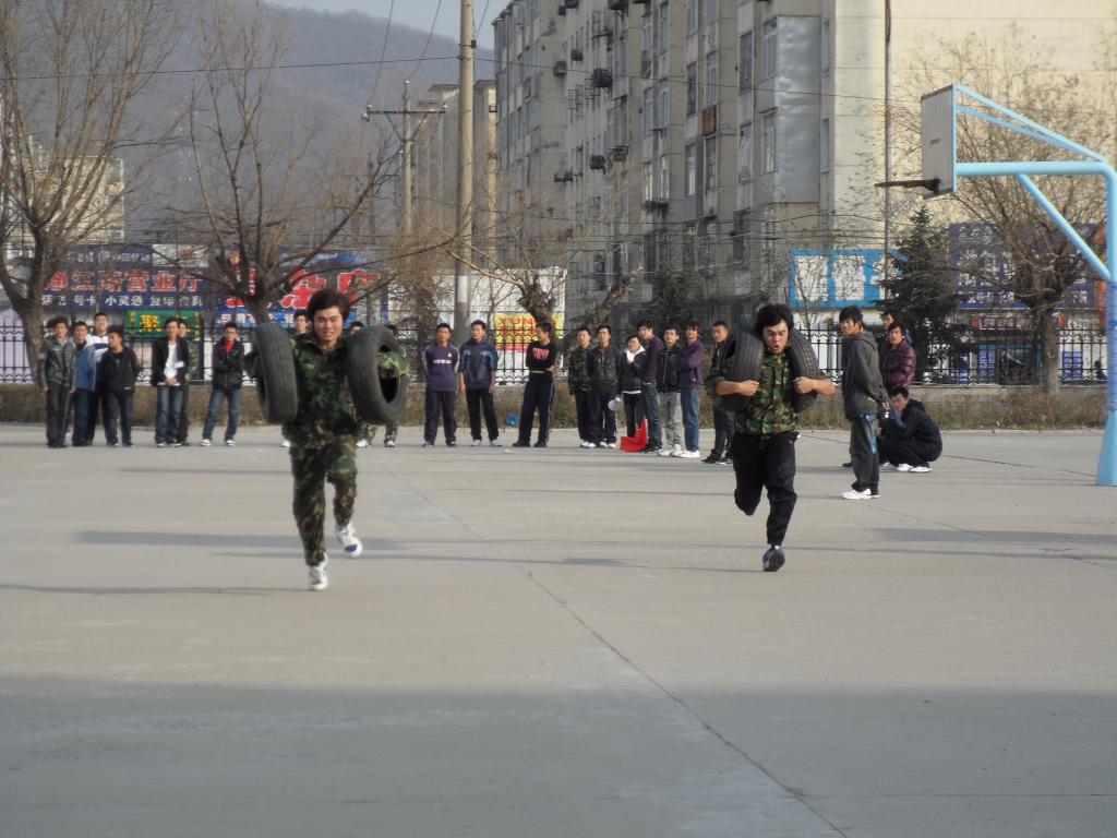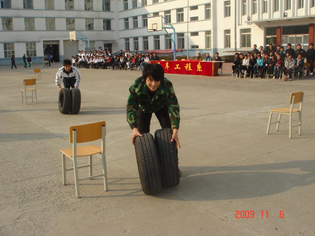 为了使此项赛事不断有所创新,今年对其中两项进行了修改。将100米接力跑,改为60米负重跑,选手在跑的同时要双肩背负两个汽车轮胎;将90米接力推车,改为三人四足推车60米,增加了活动的趣味性和协作性。整个活动在热烈,欢乐的气氛中进行。选手们在赛场上努力拼搏,60米负重跑要的是速度和体力,蛇形推轮要的是耐心和技巧,三人四足推车要的是集体的协作,每个选手在拼搏的同时也享受着比赛的乐趣。观众们则在场下欢呼呐喊,给选手们加油助威,其投入的程度,丝毫不逊场上的选手。正赛过后,08级的同学还进行了架车、对换车轮的表演,他们熟练的手法,敏捷的动作也博得了阵阵掌声。