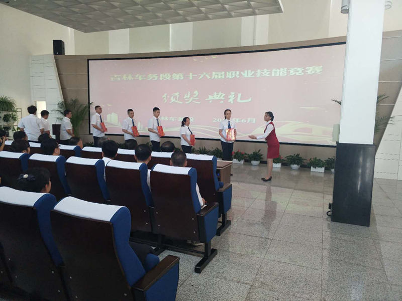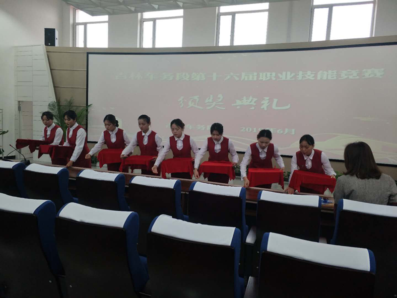 为落实沈阳局集团公司学习小东站“一点都不能差,差一点也不行”活动精神,进一步激发干部职工学标、对标、达标的积极性,吉林车务段于6月中旬举行第十六届职业技能竞赛,经过近一周的激烈角逐,全段共45名选手脱颖而出。6月14日在吉林车务段江北职工培训基地进行表彰,车务段全体领导班子、中层干部出席颁奖典礼。铁道运输学院铁道运营教研室教师李慧欣作为指导教师、高速铁路乘务专业2017级徐冰冰、文佳杰等八名学生担当本次典礼的服务、礼仪、引导工作。