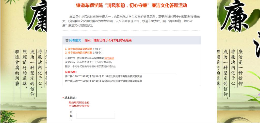 为把廉洁教育与青年学生思想道德建设相结合,利用网络平台开展廉洁知识竞赛,组织学生学习反腐倡廉相关知识,强化大学生廉洁修身意识。其中,网上答题活动有1000余名同学参与答题,将廉洁知识学习覆盖到每一名学生。