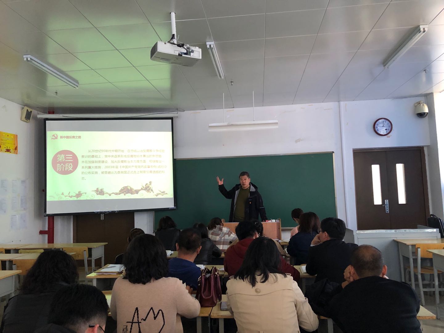 课上,徐光华分别从廉政概述、反腐倡廉的必要性和意义、新中国反腐之路、反腐倡廉新要求、谈教师反腐等五个方面生动讲解了廉政党课。勉励大家做人要有责任感、大局观、集体荣誉感,要有真诚之心、谦让之心、宽容之心,要有勤学善思的意识、真抓实干的本领、真诚合作的态度。同时,徐光华要求大家要全面深入学习贯彻习近平新时代中国特色社会主义思想和党的十九大精神,切实增强“四个意识”、坚定“四个自信”、做到“两个维护”。坚定不移推进全面从严治党,要时刻紧绷廉洁自律这根弦,把教书育人与自我修养结合起来,为建设国内一流、国际知名的特色高水平职业技能型大学贡献每个人的智慧和力量。
