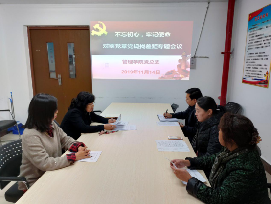 根据学校《关于“不忘初心、牢记使命”主题教育对照党章党规找差距专题会议方案》安排部署,11月14日下午,管理学院党总支召开总支委员对照党章党规找差距专题会议,学校主题教育领导小组周环宇同志到会指导,管理学院党总支副书记杨秀主持会议,党总支委员参加会议。