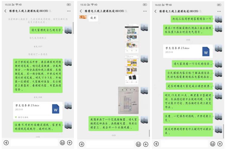 2月3日下午3:00,张青青老师的《维修电工实训》在智慧职教平台进行线上教学,授课班级机电设备1801、1802班。上课前一天,张青青老师通过建微信群给学生下发任务单;上课时,通过云课堂APP课前发复习资料,课中签到,学生自学课件、讨论之后,老师对需要注意问题针对性强调,布置作业;课后,学生课后完成作业,2月4日线上答疑,2月5日学生线上上交作业,教师清晰安排上课任务,把控上课节奏,学生参与度高,评价好。