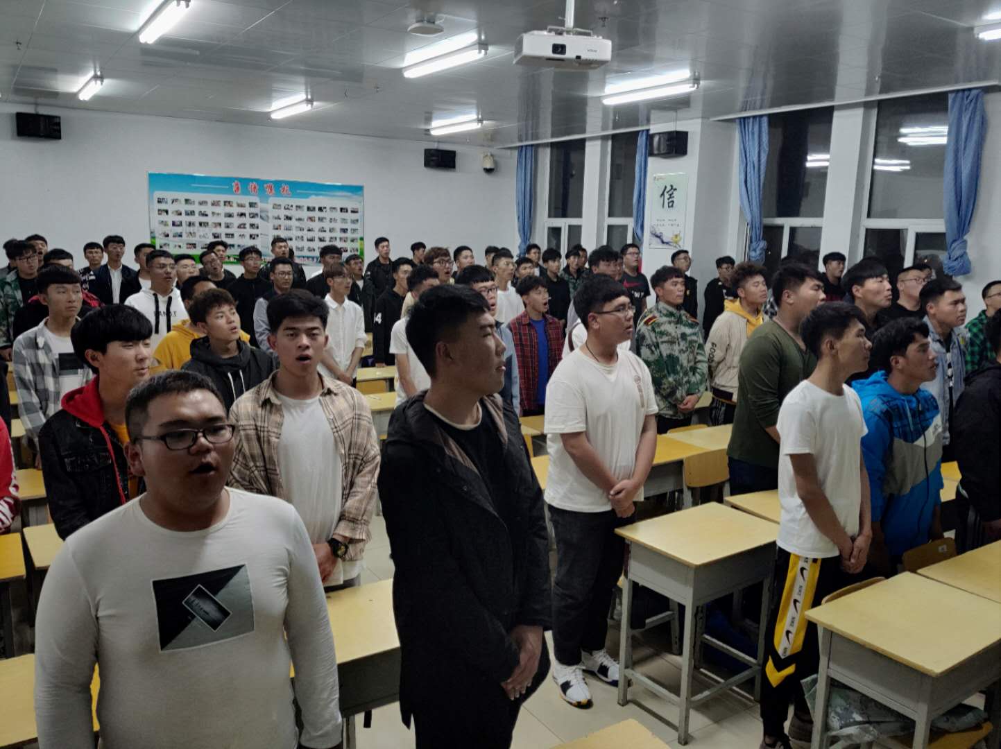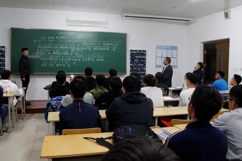 嘹亮的歌声是青年人拼搏的号角,坚定的目光是团员们精神的体现。现场,由各班团支书讲解团歌的创作背景和历史,并带领同学们学唱团歌。当晚,学院党委副书记徐彤宝、学生处处长刘树全、副处长张鑫、副处长刘佳佳、学院团委书记于威和陈思老师深入基层巡查晚自习情况,对分院的此次团日活动予以了充分的肯定。
