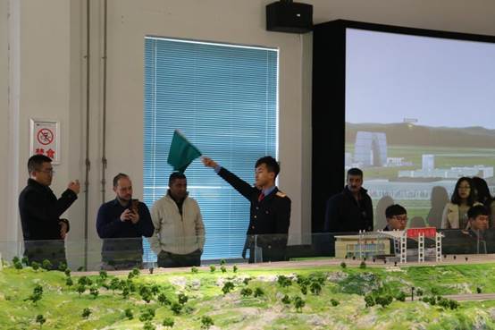 活动中,赵贺老师负责对实训场整体情况进行介绍,叙利亚交通运输研修班成员对于高铁运营仿真沙盘实训室内实训系统的仿真性产生强烈兴趣。随后,由院内职业技能大赛第一名获得者的在校生进行接发车模拟演练,演练项目包括双线自动闭塞正常情况下接发车作业。演练展示结束后,由朱鹏老师对于实训项目及接发车作业流程进行项目讲解,并指导研修班成员完成动手操作。接发车操作技能交流之后,吴荣波副院长以全国铁路接算站示意图为基础,为成员讲解客运岗位技能培养要点。此次实践教学的第四项内容由段秀军老师为学员讲解无线调车灯显设备的作用与操作。四项教学讲解活动结束后,研修班成员与于院长和各位专业教师围绕专业建设和对接岗位实训内容展开研讨。