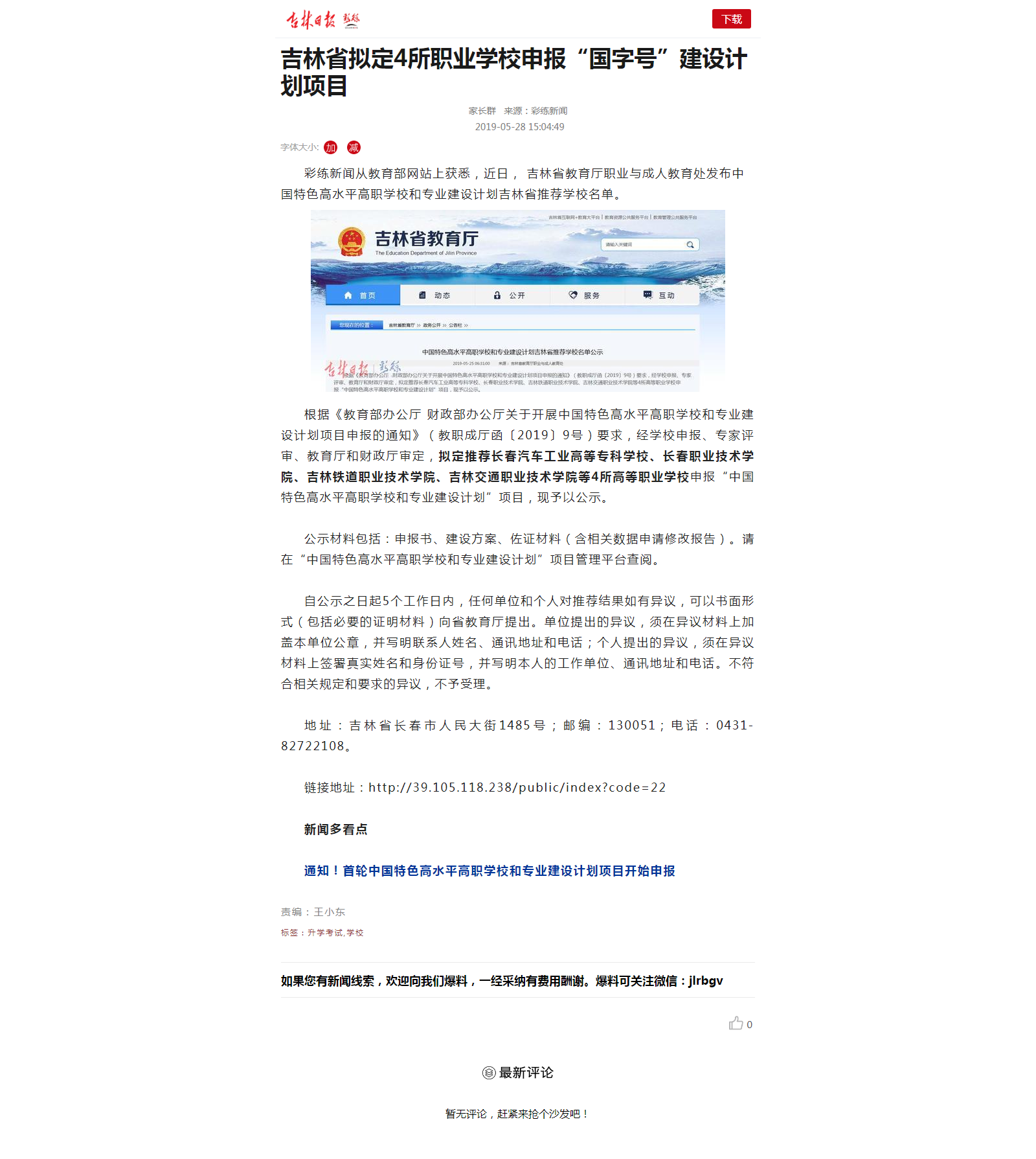 5月28日,《吉林日报》彩练新闻等媒体对吉林省教育厅将我校与另外三所高职院校作为中国特色高水平高职学校和专业建设计划公示单位进行了报道。