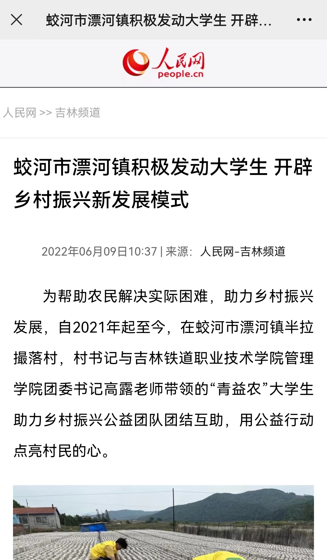 6月9日,【人民网】“人民网”以“蛟河市漂河镇积极发动大学生 开辟乡村振兴新发展模式”为题对我校进行了报道。