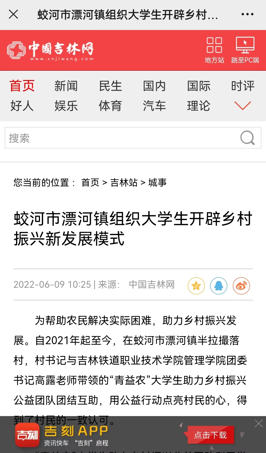 6月9日,【中国吉林网】“中国吉林网”以“蛟河市漂河镇组织大学生开辟乡村振兴新发展模式”为题对我校进行了报道。