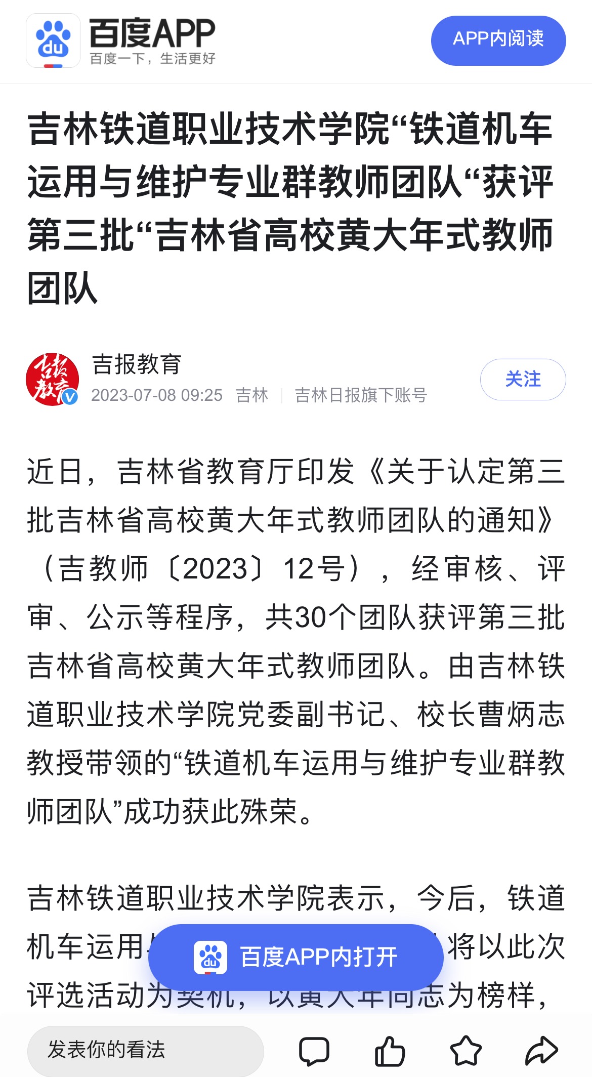 7月8日,【吉报教育】以“www.yuebo136.com ‘铁道机车运用与维护专业群教师团队’获评第三批‘吉林省高校黄大年式教师团队’”为题对我校进行了报道。