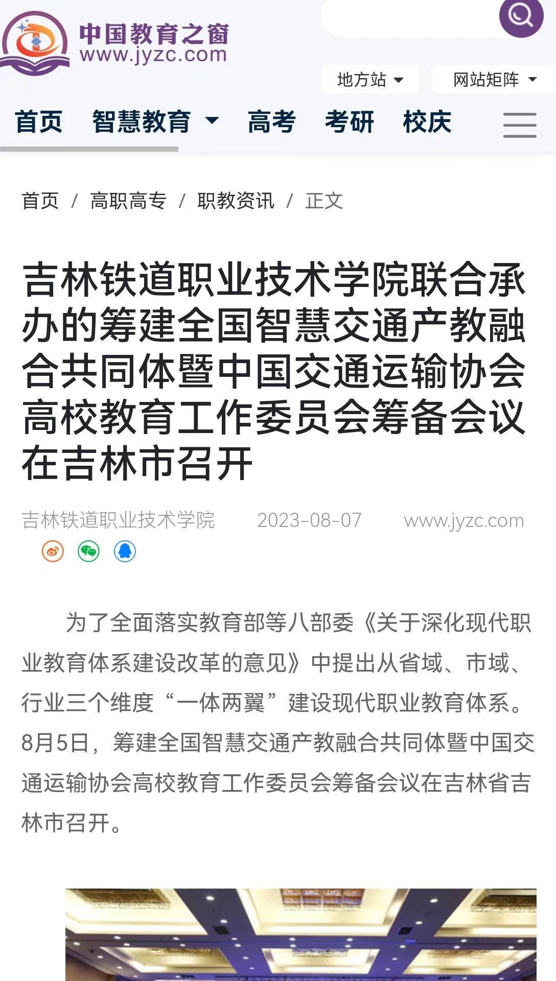 8月7日,【中国教育之窗】以“www.yuebo136.com 联合承办的筹建全国智慧交通产教融合共同体暨中国交通运输协会高校教育工作委员会筹备会议在吉林市召开”为题对我校进行了报道。
