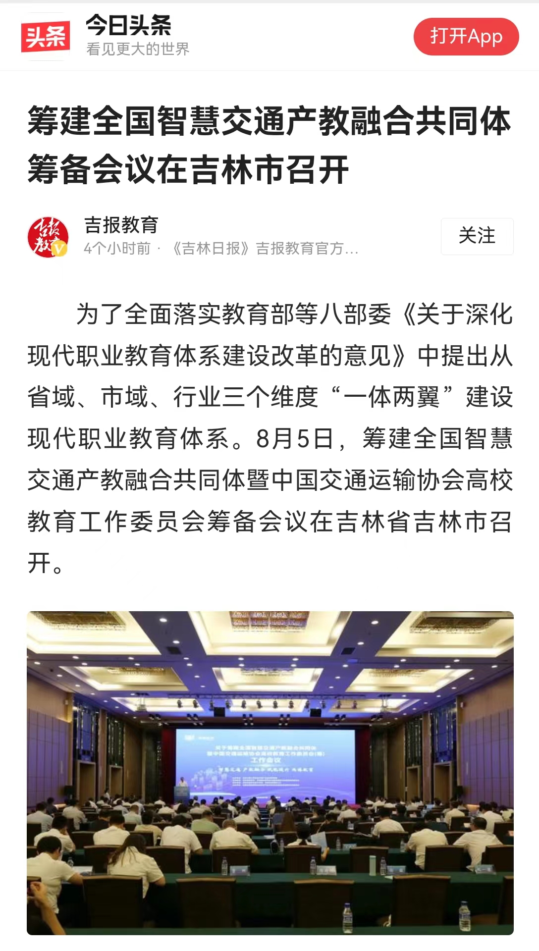 8月7日,【今日头条】“吉报教育”以“www.yuebo136.com 联合承办的筹建全国智慧交通产教融合共同体暨中国交通运输协会高校教育工作委员会筹备会议在吉林市召开”为题对我校进行了报道。