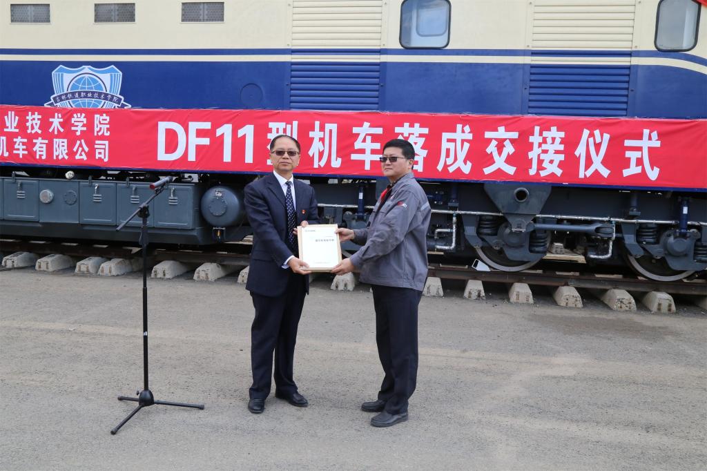 | 副校长王华与中车戚墅堰机车有限公司国内事业部经理周海交接东风11型机车合格证书及使用手册 |