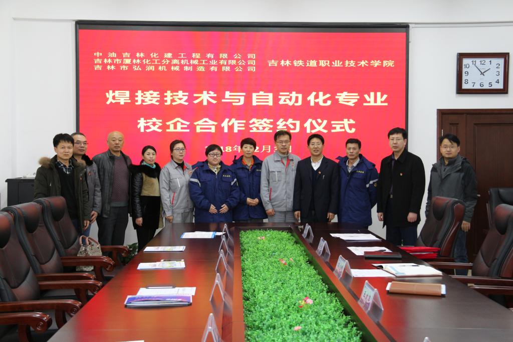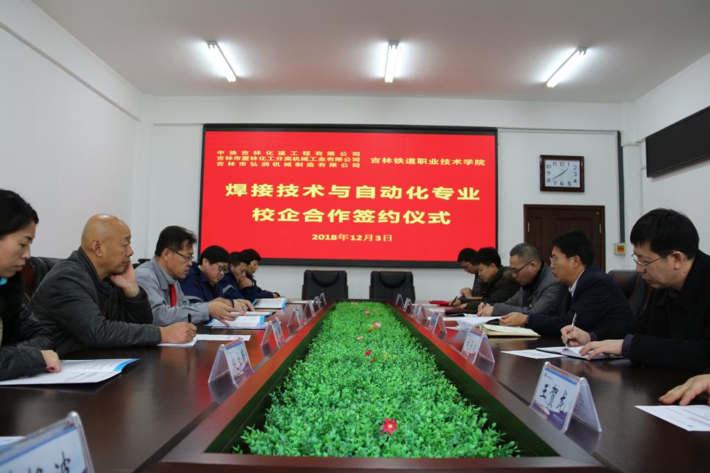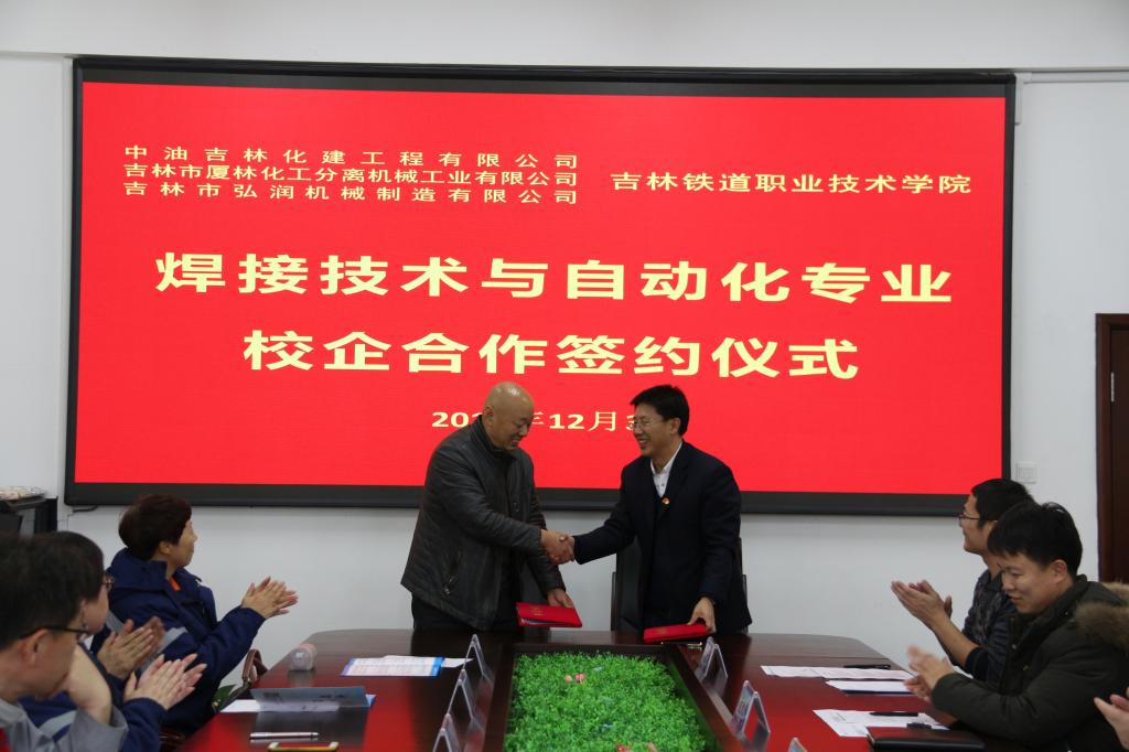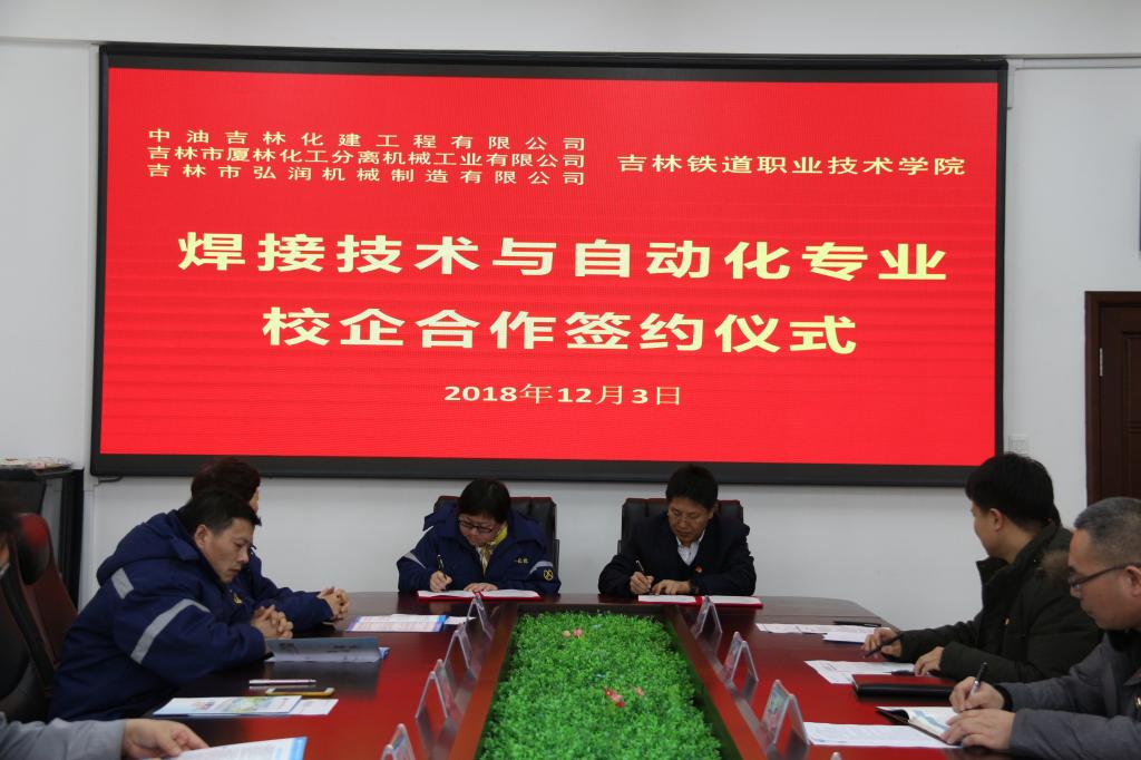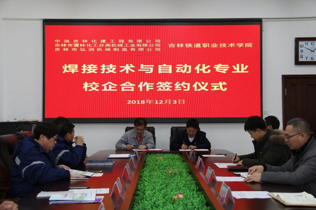 12月3日下午,机械工程分院在办公楼第一会议室举行焊接技术与自动化专业与中油吉林化建工程有限公司、吉林市厦林化工分离机械工业有限公司和吉林市弘润机械制造有限公司校企合作签约仪式。吉林市厦林化工分离机械工业有限公司总经理王铎凝、吉林市弘润机械制造有限公司经理张明、中油吉林化建工程有限公司总经理助理崔智勇、学院校企合作处处长王建军、机械工程分院党总支书记刘锡权、分院院长孙志刚、焊接自动化教研室主任王贺龙等参加了本次仪式。签约仪式由机械工程分院副院长董大伟主持。
