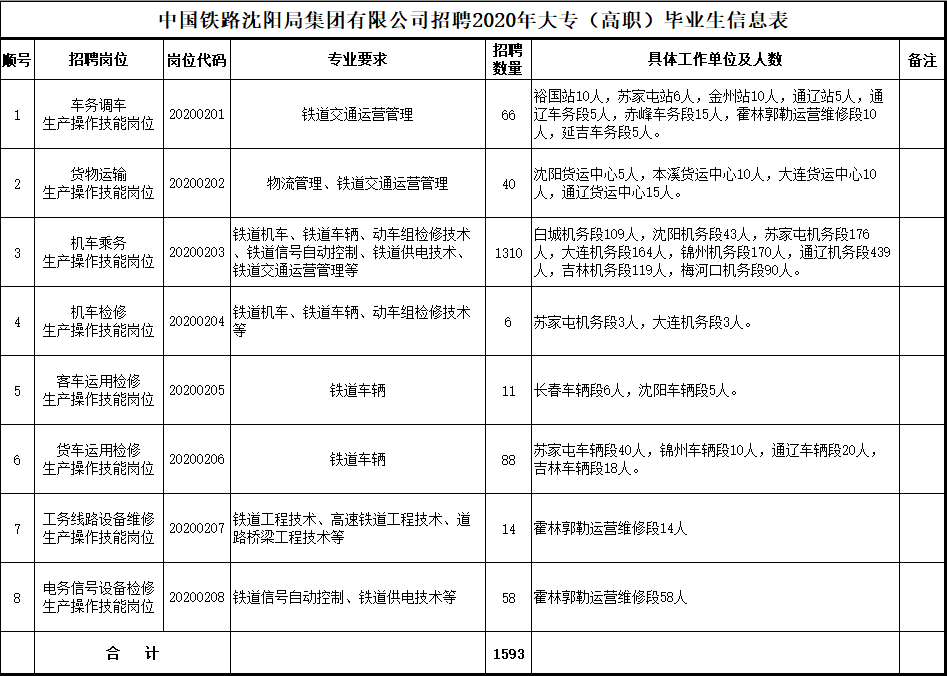 中国铁路沈阳局集团有限公司根据工作需要,现招聘2020年全日制普通高等院校大专(高职)学历毕业生。具体事宜公告如下: