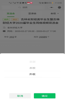 2.非主办方(其他学校):进入双选会频道后,请点击右上方“本校-外校”,点击确定,切换至外校双选会,点击本场双选会入场参会。