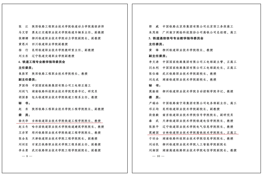 2022年8月2日,中国国家铁路集团有限公司在北京召开了全国铁道职业教育教学指导委员会(简称:铁道行指委)工作会议。会上印发了《关于公布铁道专业教学指导委员会(2021—2025年)组成人员的通知》(铁道行指委〔2022〕2号)文件,新一届铁道行指委下设7个专业教学指导委员会,分别为:铁道运输、铁道机车、铁道车辆、铁道工程、铁道通信信号、铁道供电、铁道装备制造专业教学指导委员会(简称“铁道专指委”)。