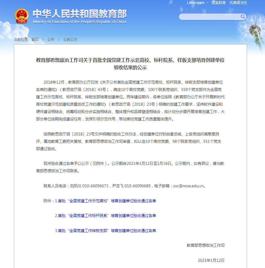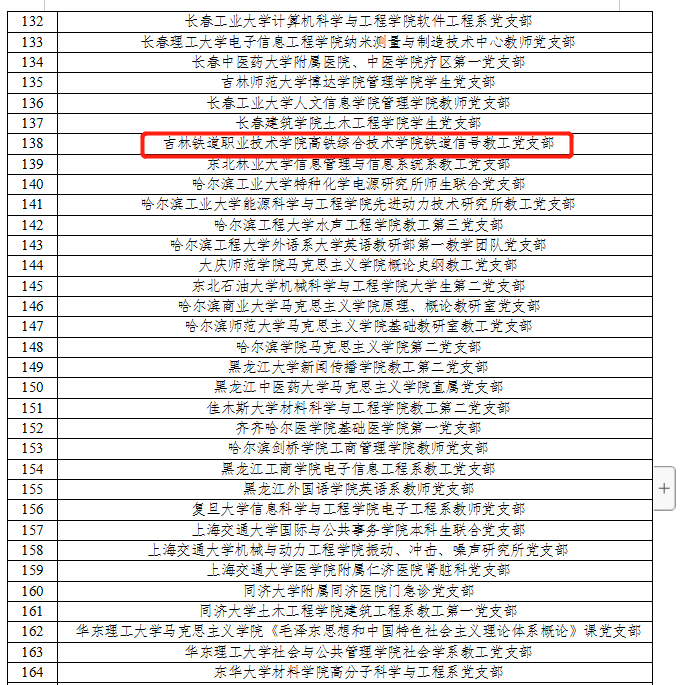 2021年1月12日,教育部思想政治工作司公示了首批全国党建工作示范高校、标杆院系、样板支部培育创建单位验收结果,我校高铁综合技术学院铁道信号教工党支部在“全国党建工作样板支部”培育创建单位验收通过名单中榜上有名,到1月18日公示期满。