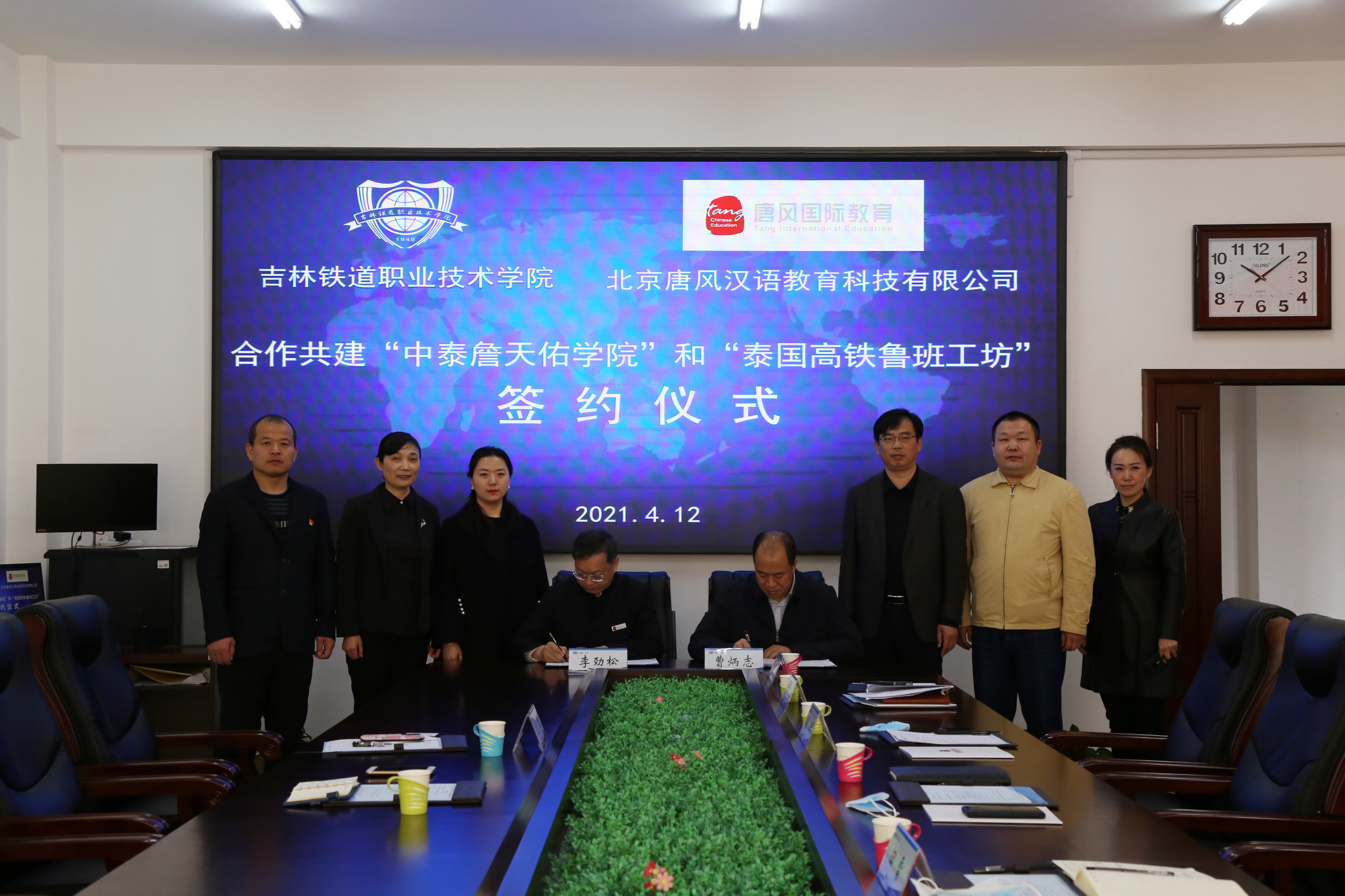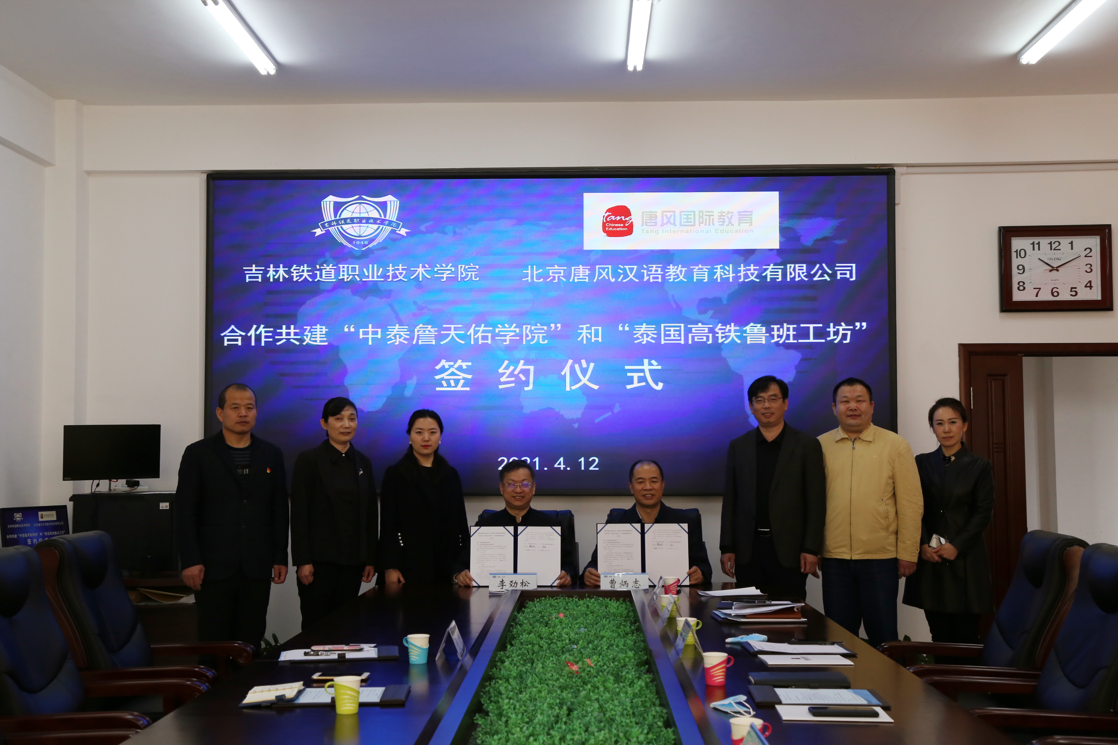 4月12日上午,我校与北京唐风汉语教育科技有限公司共建“中泰詹天佑学院、泰国高铁鲁班工坊”签约仪式在行政办公楼3楼第一会议室举行。北京唐风汉语教育科技有限公司总裁李劲松、高级院校合作经理李壑,我校党委副书记、校长曹炳志,副校长田雷,副校长张辉,国际交流中心主任盛莉,计划财务处处长刘本基,信息化办公室主任姜彬峰出席签约仪式,仪式由盛莉主持。
