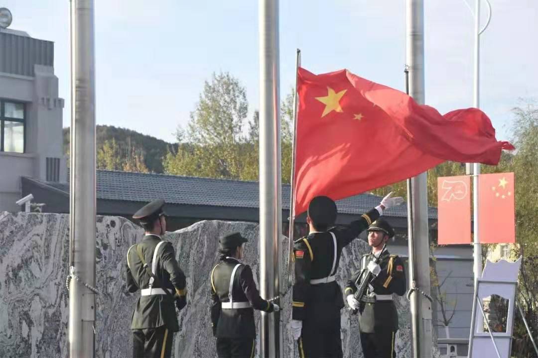 上午7点10分,升旗仪式正式开始,鲜艳的五星红旗徐徐升起,全场庄严肃立,齐声高唱国歌,向国旗敬注目礼,向伟大祖国献上最美好的节日祝福。