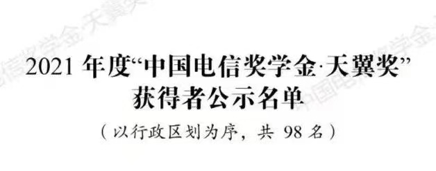 在2021年度“中国电信奖学金”推报活动中,经校级、地市级分别推荐、省级初评和全国评审,初步确定“中国电信奖学金·天翼奖”获得者98名,“中国电信奖学金·飞Young奖”获得者1486名。我校2022届优秀毕业生赵世伟同学荣获2021年度“中国电信奖学金·天翼奖”。