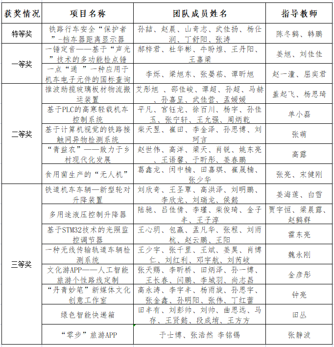 校赛期间,校团委充分整合校内优势学科资源,不断创新工作思路,开展线上培训活动,协助项目团队潜心打磨作品。同时组织校外专家开展线上评审,择优推选项目作品参加省赛,最终我校报送的16件作品在省赛中取得优异成绩。目前,获得特等奖的《铁路行车安全“保护者”-挡车器距离显示器》项目团队将代表吉林省角逐国赛,希望团队再接再厉,取得优异成绩!