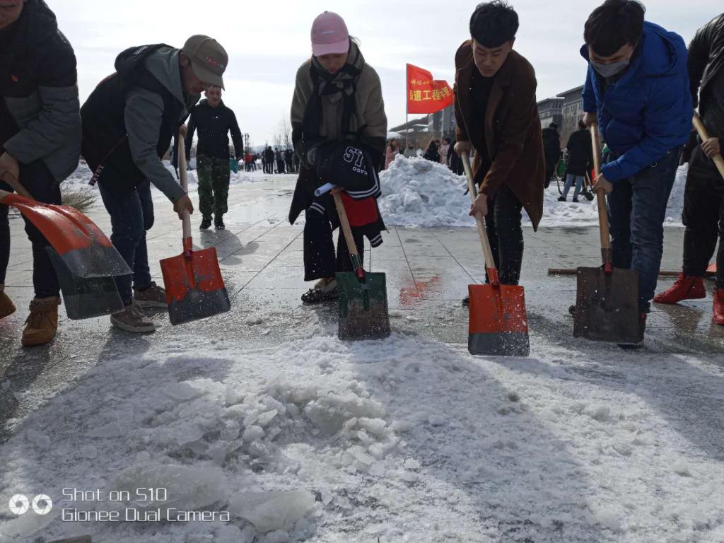 天气寒冷,但寒风阻挡不了学生干部们志愿服务的热情;工具有限,学生就自动分为两组,前面同学干到没有力气了,第二组学生马上接替他的工作。学生轮番清理,干劲十足,在大家齐心协力的配合下,完成了学校布置的清雪、清冰任务。