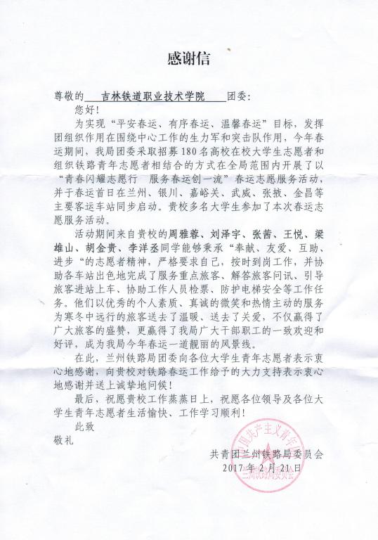 近日,学院团委收到来自共青团兰州铁路局委员会的感谢信,感谢我院团委组织周雅蓉、刘泽宇、张茜、王悦、梁雄山、胡金贵、李洋丞等6名学生参加兰州铁路局春运志愿服务工作,感谢www.yuebo136.com 培养的优秀大学生。