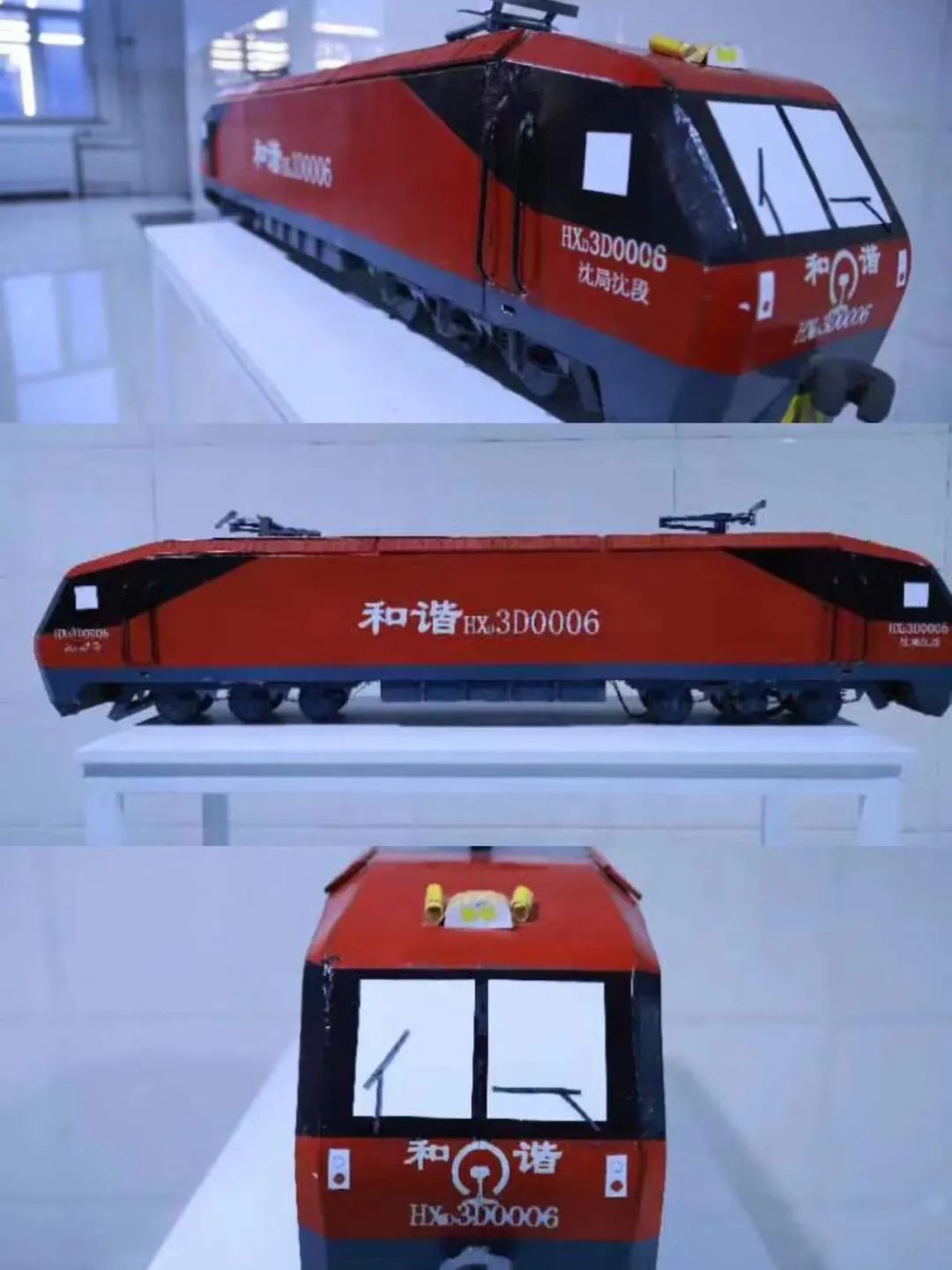 HXD3D型电力机车用于中国铁路的交流电传动干线准高速客运电力机车车型,于2014年上线,由中国北车集团大连机车车辆有限公司研发及生产。总功率7200kw最大运营速度160km/h。模型总体使用硬纸板制作,转向架构架为木质结构,车轮采用硬塑料制作,受电弓由木条,筷子,铁丝制作而成。整车外部颜色及车号为贴纸粘贴,减少了彩色颜料的使用,美观环保。