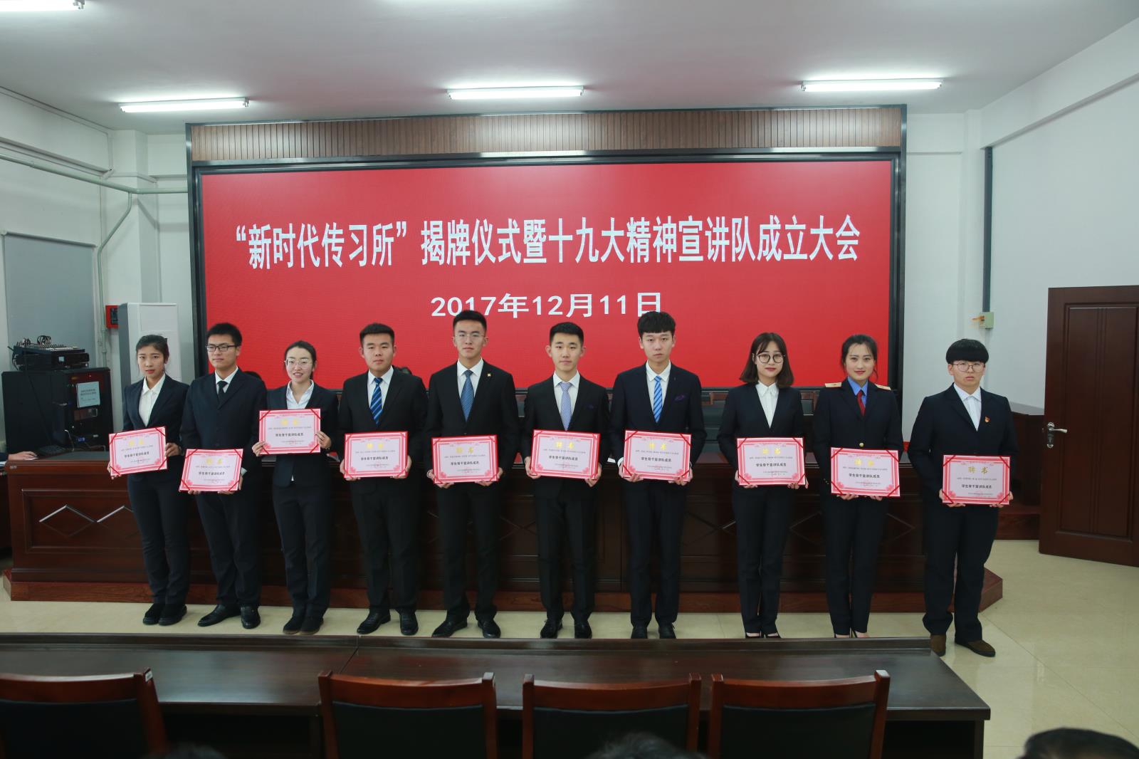 会上,首先进行了学院“新时代传习所”成立揭牌仪式暨党的十九大精神辅导员宣讲队、学生骨干宣讲队成立仪式,学院党委书记王喜库、党委副书记徐彤宝为“新时代传习所”揭牌,学院领导为党的十九大精神辅导员宣讲队、学生骨干宣讲队成员颁发聘书。