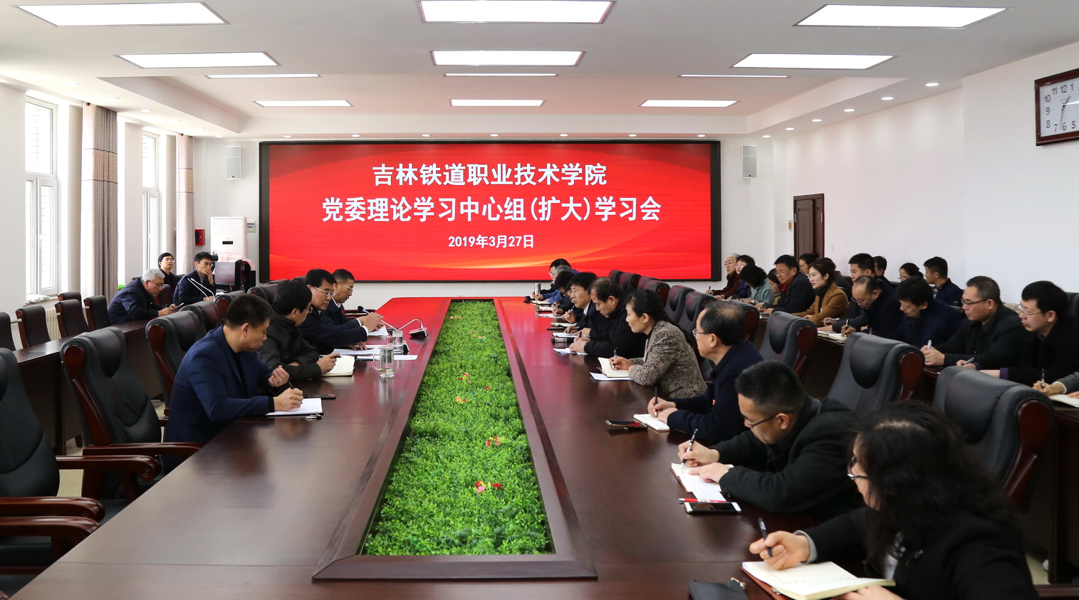 13:30,学院党委理论学习中心组在行政办公楼第二会议室召开2019年度第三次集中扩大学习会,专题学习贯彻习近平总书记在学校思想政治理论课教师座谈会上的重要讲话精神。学院党委理论学习中心组成员,各单位、部门主要负责人,全体思政课教师参加了学习会。学习会由学院党委书记胡越平同志主持。