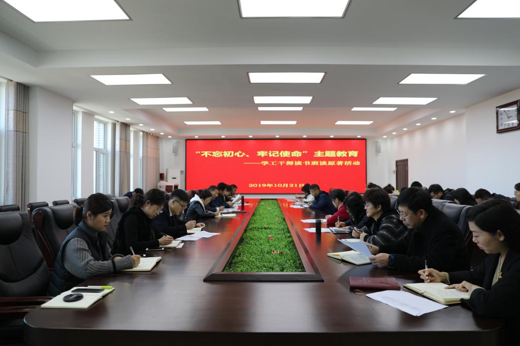 2019年10月21日下午,在行政办公楼第二会议室,学校学工系统召开“不忘初心、牢记使命”主题教育——学工干部读书班读原著活动。学校党委副书记徐彤宝、学生工作处全体、校团委全体、各学院党总支书记、学办主任、分团委书记、新疆籍辅导员参加了此次活动。