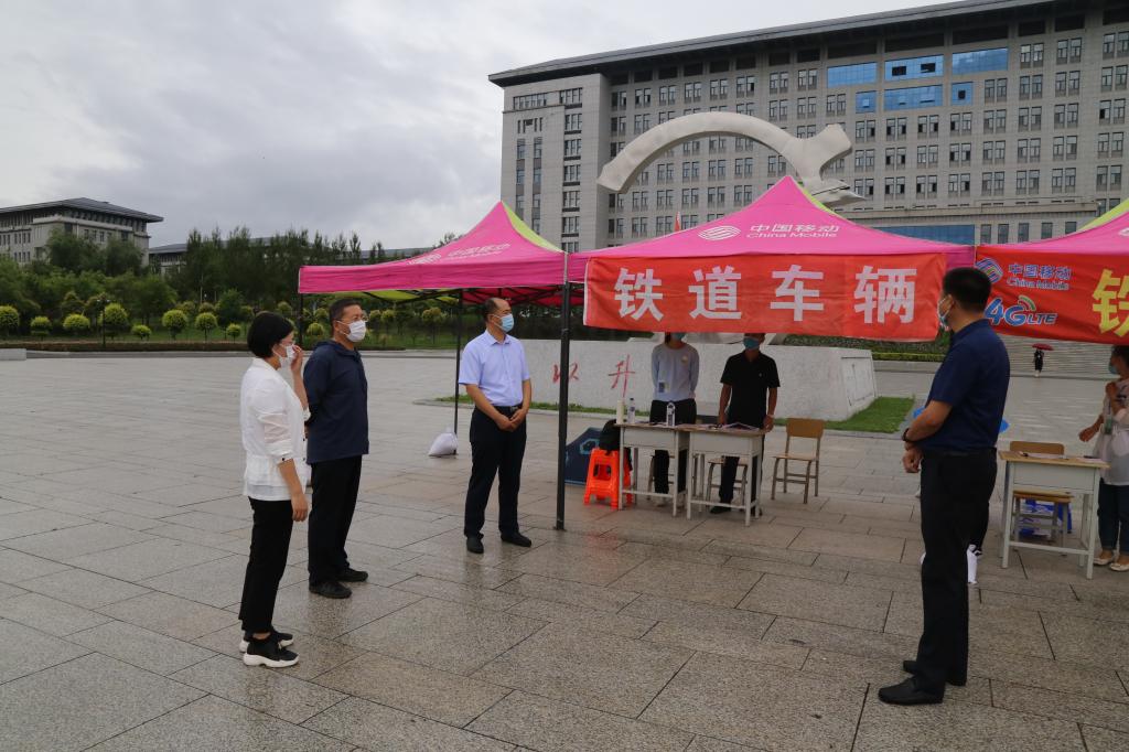 8月28日,校长曹炳志,党委副书记徐彤宝,副校长李欣在相关部门负责人陪同下,到学校学生返校接待处,看望慰问2020年秋季开学首批返校学生。