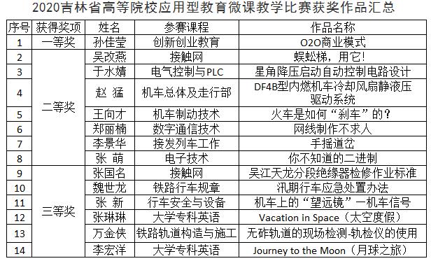 12月18日,2020吉林省高等院校应用型教育微课教学比赛评审结果揭晓,我校共有14名教师的参赛作品获个人作品奖,其中一等奖1项,二等奖7项,三等奖6项。2个团队获评微课优秀团队奖,学校推荐的评委张辉教授、周云凌教授获评为优秀评审专家,学校荣获大赛组委会颁发的“优秀组织奖”。